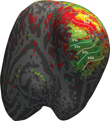 As you can see in the image above of the inflated surface of a right hemisphere with angular values of highest correlation within each voxel of the occipital regions, the red color would correspond to the lower part of the vertical meridian in the visual field and the dark green color would correspond to the upper part of the vertical meridian.